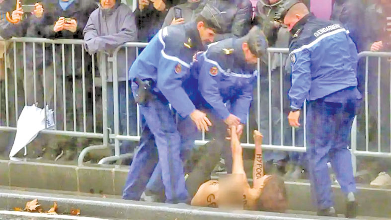 પહેલા વિશ્વ યુદ્ધની સમાપ્તીનાં ૧૦૦ વર્ષ પુર્ણ થવા અંગે પેરિસનાં ઐતિહાસિક આર્ક દે ત્રાયોફમાં રવિવારે આયોજીત કાર્યક્રમમાં ભારતના ઉપરાષ્ટ્રપતિ વેંકૈયા નાયડૂ, ડોનાલ્ડ ટ્રમ્પ સહિત વિશ્વનાં ઘણા નેતાનો સમાવેશ થાય છે. આ દરમિયાન જ્યારે ડોનાલ્ડ ટ્રમ્પનો કાફલો આવી રહ્યો હતો તો એક ટોપલેસ પ્રદર્શનકર્તાઓએ સુરક્ષા ઘેરો તોડીને ટ્રમ્પની નજીક જવાનો પ્રયાસ કર્યો. સુરક્ષા કર્મચારીઓએ તુરંત જ તે પ્રદર્શનકારીઓને ત્યાંથી હટાવ્યા. આ મહિલા પ્રદર્શનકર્તાઓએ પોતાનાં શરીર પર ફેક અને પીસ શબ્દ છપાવેલા હતા.