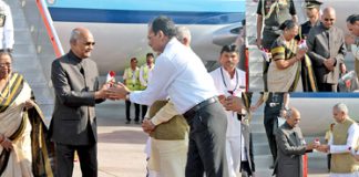 રાષ્ટ્રપતિનું અમદાવાદ વિમાન મથકે રાજ્યપાલ તથા મુખ્યમંત્રી દ્વારા ઉષ્માભર્યું સ્વાગત